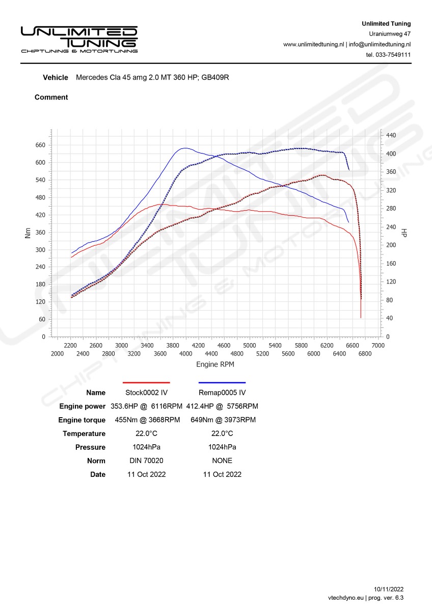 Met chiptuning van de Mercedes Benz CLA45 AMG 360 pk zullen de motorprestaties sterk verbeterd worden. De standaard waardes zijn de fabrieksopgave. Alle Eco- Normal- en Xtreme Tuning waardes zijn uitgemeten op een vermogenstestbank. Na het uitvoeren van de chiptuning zult u direct het verschil ervaren. De auto rijdt rustiger, stiller, sneller en zuiniger. Doordat u een hoger koppel tot uw beschikking heeft voelt de auto comfortabeler en "lichter" aan.