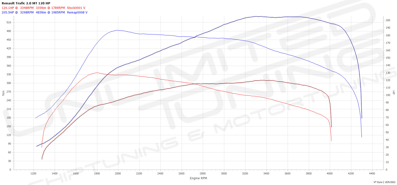 Met chiptuning van de Renault Trafic 2.0 DCI 145 pk zullen de motorprestaties sterk verbeterd worden. De standaard waardes zijn de fabrieksopgave. Alle Eco- Normal- en Xtreme Tuning waardes zijn uitgemeten op een vermogenstestbank. Na het uitvoeren van de chiptuning zult u direct het verschil ervaren. De auto rijdt rustiger, stiller, sneller en zuiniger. Doordat u een hoger koppel tot uw beschikking heeft voelt de auto comfortabeler en "lichter" aan.